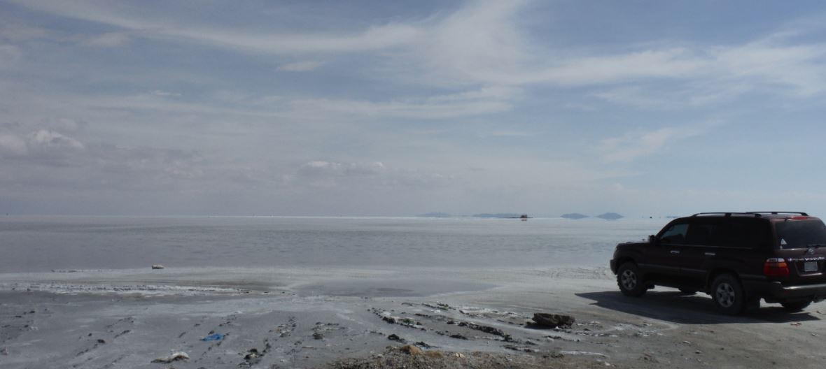 四駆に揺られていると、突然道が途切れ、湖が始まります。ここがウユニ塩湖の入口。現地ドライバーさんは、臆することなくそのまま四駆を進めます。どのツアーも、みな乗っているのはトヨタのランドクルーザー。日本車の強さを実感しますね。